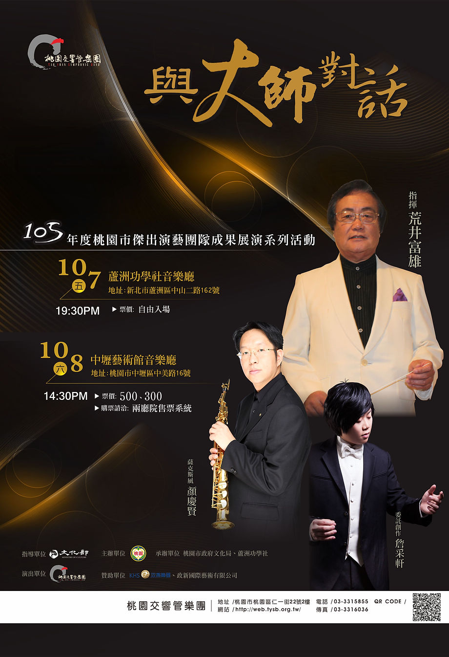 本團以人為本、以文化為根、以教育為樁、以音樂為體為宗旨,並每年安排「與大師對話」系列音樂會,為桃管年度重要且具指標意義的音樂展演,同時亦為團隊與世界接軌的重要管道;此次演出邀請日本指揮家荒井富雄擔任此次客席指揮,委託作曲家詹采軒創作薩克斯風協奏曲,並邀請顏慶賢演奏家與桃管一同演出。